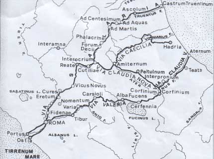 Interocrium, si bipartiva. Un ramo, riprendendo la direzione al Nord seguiva il corso di quel fiume percorrendo il difficile tramite della gola dirupata tra il Terminillo ed il monte Giano, sorpassava l'Appennino centrale e scendeva nella valle del Tronto, che non abbandonava più arrestandosi alle foci di quel corso d'acqua nell'Adriatico. L'altro ramo da Interocrium volgeva a levante, scavalcava l'Appennino per altre gole con ripida discesa sui piani di Amiternum e proseguiva per il paese Pretutii. Questi due rami principali si diramarano, in epoche sempre lontane, altri diverticoli secondari . Tra gli itinerari conosciuti sono : Itinerario detto di Antonio, Itinerario della Tab. Peutingeriana, Itinerario detto Ravennate, Itinerario dell'Olstenio) |