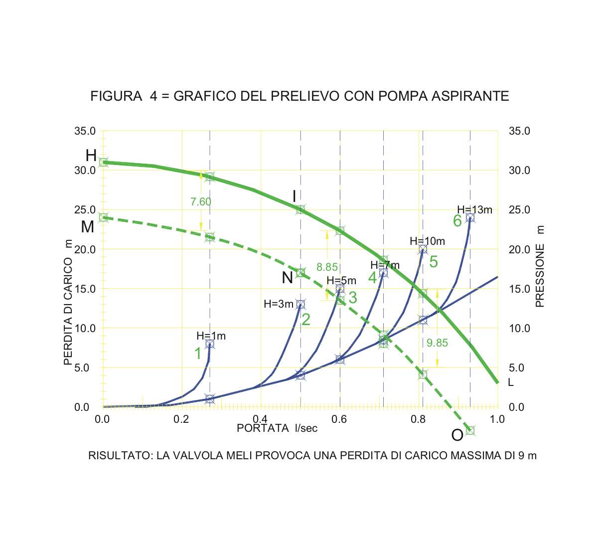 Come si può vedere la curva di funzionamento M N O è parallela a quella H I L caratteristica della pompa dalla quale differisce per circa 9 m di prevalenza. Ciò conferma che la valvola non chiude totalmente ma, come già indicato, quando è alla massima strozzatura diminuisce la pressione di 9 m. L'utente viene penalizzato in quanto può prelevare dalla rete solo portate inferiori a 0.70 l/sec per avere una pressione di mandata come minimo superiore ai 10 m necessari per la rete privata interna. Per portate più elevate la pressione scende a valori insufficienti e diventa negativa per la portata massima pari a 0.9 l/sec. Fig.5