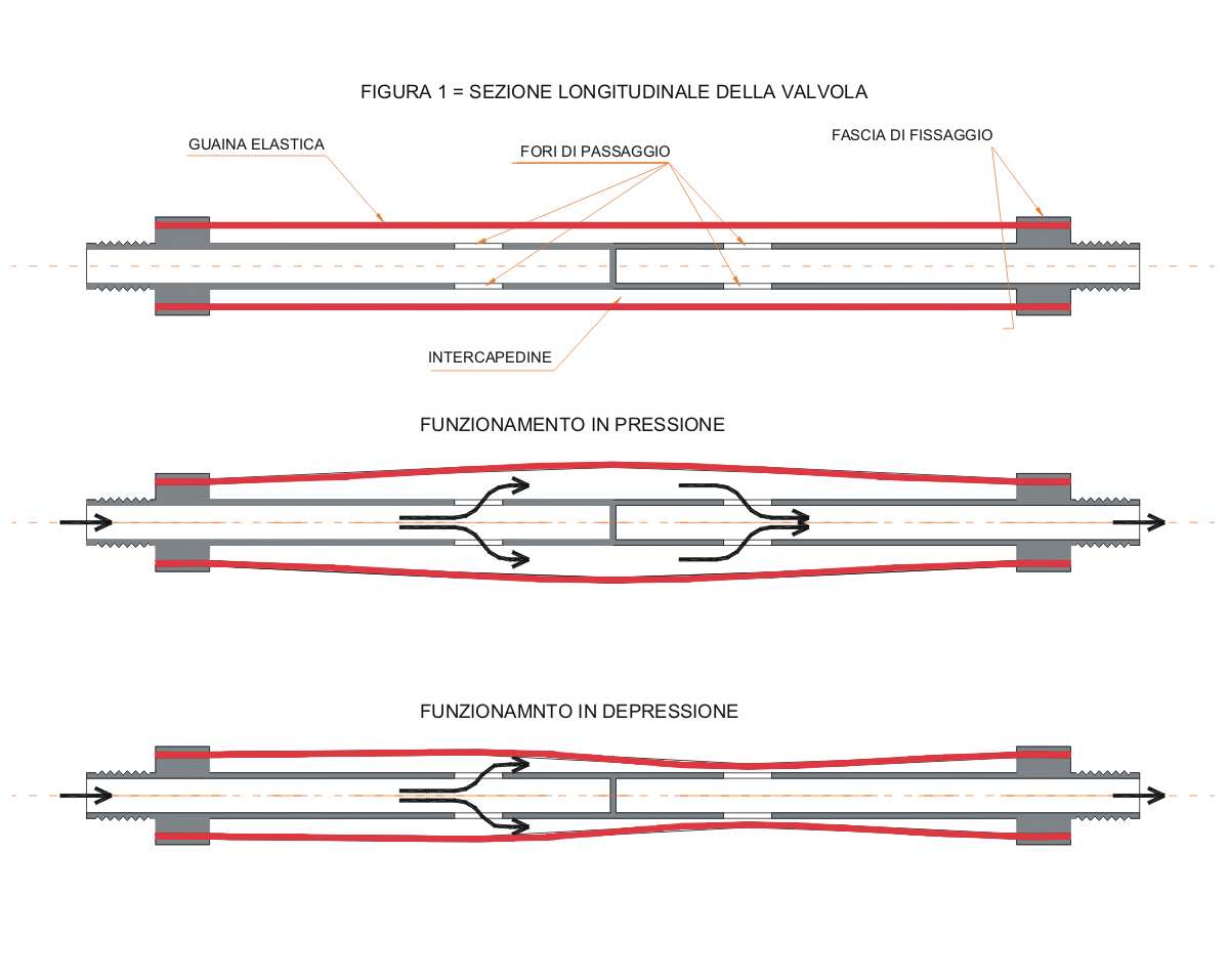 La valvola è costituita (v. Fig.1) da un piccolo tronco di tubo, dello stesso diametro di quello dell'allacciamento di utenza da porre sotto controllo, con le estremità filettate per consentirne il montaggio e chiuso in mezzeria da un diaframma circolare interno. A monte ed a valle di quest'ultimo si trovano dei fori che consentono all'acqua di uscire all'esterno del piccolo tubo e di rientrarvi subito dopo per by-passarlo percorrendo una intercapedine formata da un manicotto concentrico, di maggior diametro ed avente le estremità ancorate al tubo stesso tramite apposite fascette. Il manicotto esterno costituisce l'organo sensibile di regolazione della valvola in quanto, in normale funzionamento cioè quando l'acquedotto è in pressione, il materiale flessibile di cui è costituito tende a farlo aumentare di diametro e quindi consente il transito dall'acqua con perdite di carico estremamente contenute. Quando invece l'utente aspira dalla rete, si produce una depressione che tende a far aderire il tubo esterno flessibile a quello interno fino a ridurre la sezione libera dei fori di passaggio dell'acqua causando delle perdite di carico più o meno rilevanti in funzione delle condizioni di funzionamento, per arrivare alla chiusura totale del flusso quando la rete è di per sé in depressione. Fig. 1