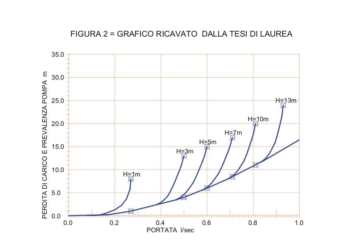 Si tratta dello stesso grafico della fig. 1) nel quale si è riportata in sovrapposizione la curva H I L che rappresenta la curva caratteristica della pompa dell'utente i cui elementi di base sono i seguenti: Prevalenza 30 m portata 0.2 l/sec Prevalenza 25 m portata 0.5 l/sec Prevalenza 19 m portata 0.8 l/sec