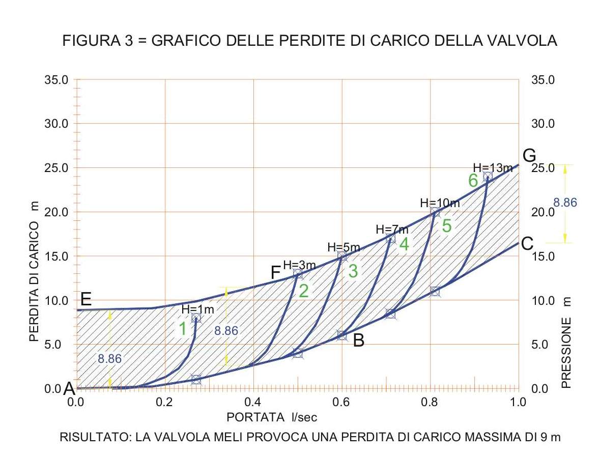 In fig. 2 è riprodotto fedelmente un diagramma che rappresenta una serie di rilievi della tesi " Indagine sperimentale su un dispositivo per il controllo dei prelievi tramite sollevamento diretto dalla rete acquedottistica" del laureando Gianluca Storaci Relatore Chiar.mo prof. Ing. Carlo Modica e correlatore Dott. Ing. Alberto Campisano dell'Università di Catania Facoltà di Ingegneria. Nella fig. 3, che ripete lo stesso grafico con alcune aggiunte, si è evidenziato come la curva A B C non sia altro che la rappresentazione grafica delle pressioni che durante le prove si riscontravano a monte del dispositivo. Poiché in corso di misura si erano rilevati e quindi riportati in diagramma le perdite di carico provocate dall'intervento della valvola al variare della pressione preesistente a monte del dispositivo, è bastato congiungere tra di loro i punti di massima perdita di carico indotta nei vari casi, per ottenere la curva E F G che rappresenta la massima depressione operata dalla valvola stessa per qualsivoglia valore della pressione di monte nell'intervallo esaminato che va da 1 a 13 metri di colonna d'acqua. Fig. 3