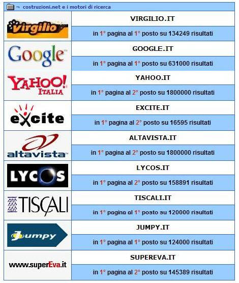 Di seguito sono riportati i posizionamenti di costruzioni.net nei più importanti motori di ricerca con la parola chiave "costruzioni".