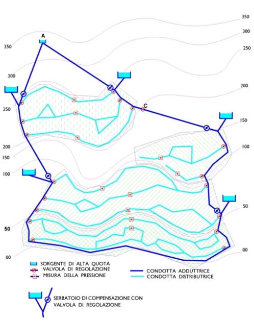 una rete di adduzione munita di serbatoi diffusi e da altrettante